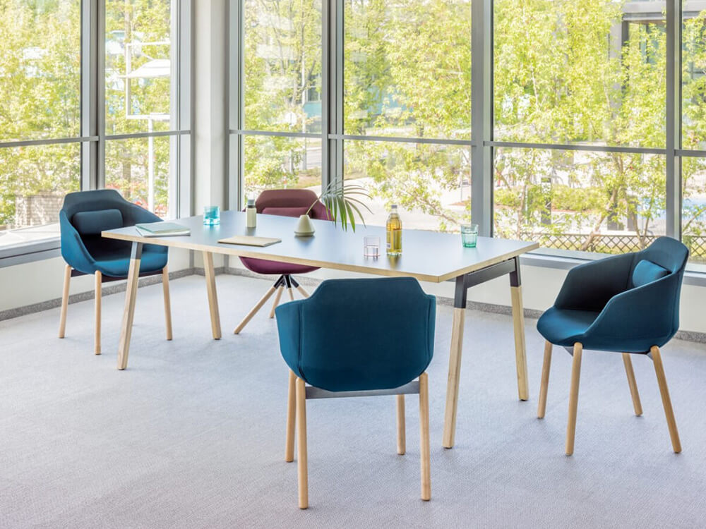 To make the calculations easier, it’s recommended to have 80 cm per person, which will help you pick the right dimensions for a meeting room table. For example, if you need four chairs in the meeting room, then you should be looking at a table of 200 cm x 100 cm. For example, this rectangular-shaped meeting table is perfect for comfortably sitting four people with its 200 x 100 cm dimensions that will allow the proper space requirements for both guests and employees.