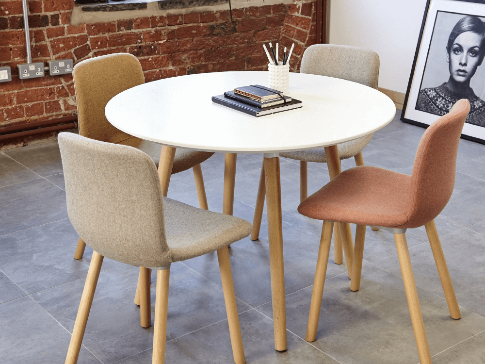 You should also consider a workspace that easily allows people in the meeting room to engage with each other. For example, a round table such as this white veneer table may be better for smaller groups, whereas a rectangular table might be better for presenting to larger groups.